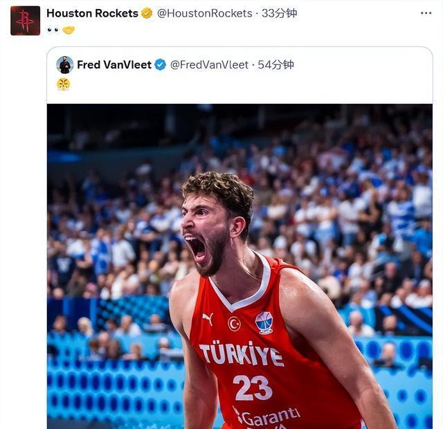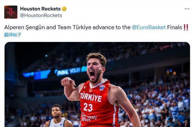 火箭官方晒申京在赛场上激情怒吼照(字母哥沦为背景板),祝贺申京和土耳其晋级欧洲杯决赛,火箭球员范弗利特也晒申京怒吼照祝贺他。