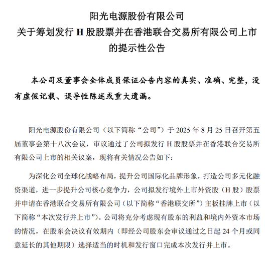 8月25日,与财报一起发布的,还有阳光电源的港股上市的公告。